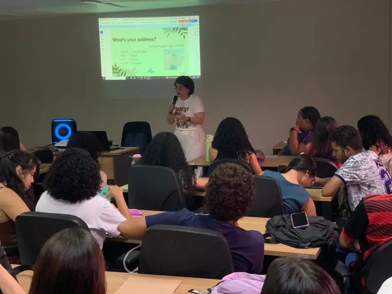 A professora de inglês Gisele Ramalho, com mais de 23 anos de experiência, explica que o curso foi planejado como uma preparação rápida para situações reais. “Em cerca de um mês, conseguimos trabalhar apresentações pessoais, atendimento ao cliente, noções de câmbio, mobilidade e simulações de vendas. A ideia é unir diversos temas de forma simples, com material totalmente em inglês, mas sempre associado à tradução, para que os alunos compreendam e comecem a pensar no idioma”, afirma.