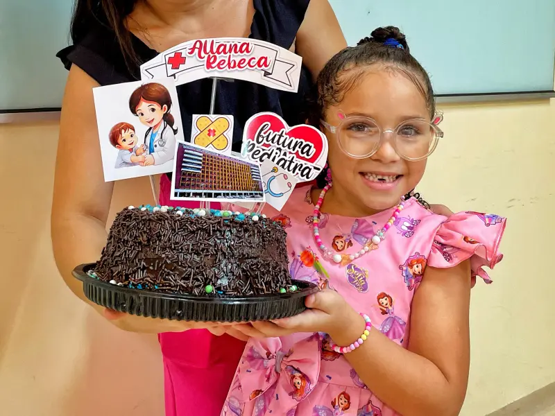 Depois de oito meses de tratamento no hospital, a pequena Allana Rebeca decidiu comemorar o aniversário de seis anos com um tema: “Futura Pediatra do Hospital Abelardo Santos”. Segundo a mãe, Rosana Cabral, de 28 anos, a escolha foi inspirada na experiência positiva da filha na unidade.