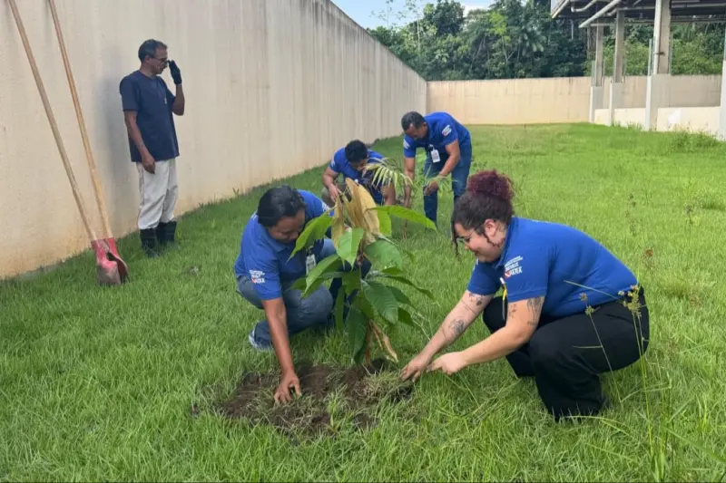 Pomar da Vida - As mudas de árvores frutíferas plantadas hoje por membros da Comissão de Sustentabilidade deram continuidade às atividades de plantio no âmbito do Projeto Pomar da Vida, em desenvolvimento no PSRM desde o início deste ano. O Projeto é voltado ao cultivo de frutíferas amazônicas, e começou com a plantação de açaí e cacau, mas já com programação de ampliar o plantio para outras espécies nativas. O Projeto busca a valorização da biodiversidade local, com o objetivo de tornar o Pronto-Socorro Dr. Roberto Macedo um espaço mais acolhedor e saudável para pacientes, profissionais e visitantes, reforçando a conexão entre saúde e sustentabilidade.