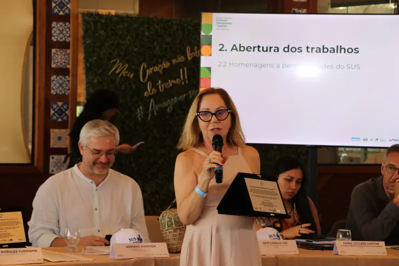 Na abertura, foram feitas homenagens em comemoração aos 35 anos do SUS a gestores e personalidades que contribuíram para a construção do sistema. Entre os homenageados, esteve a secretária de Saúde do Pará, Ivete Vaz.
