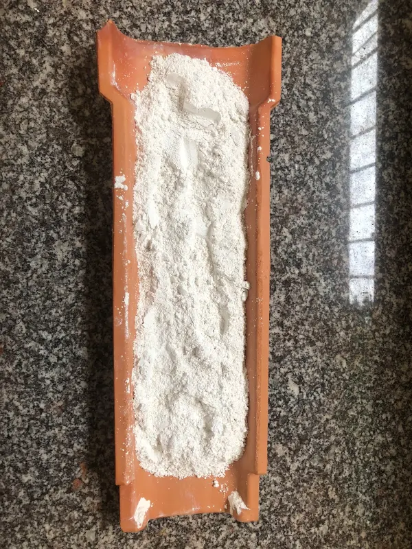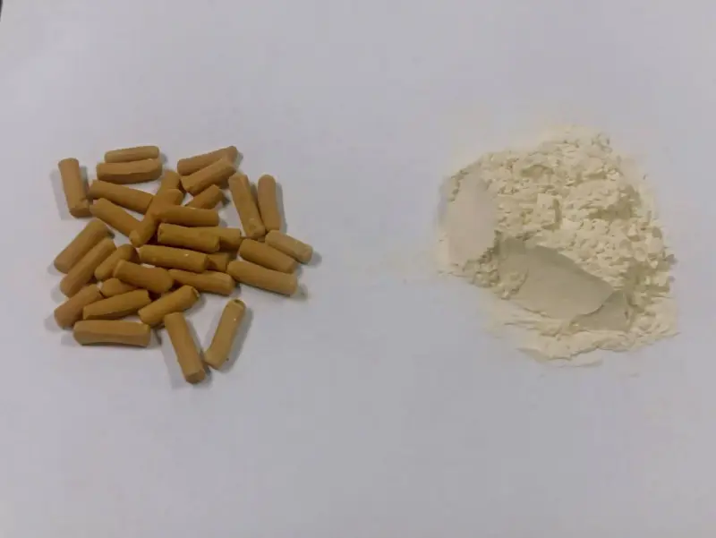 Zeólita em pó (à direita) e em peletes (à esquerda)