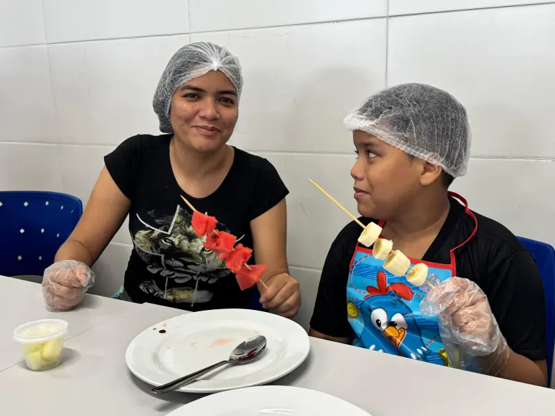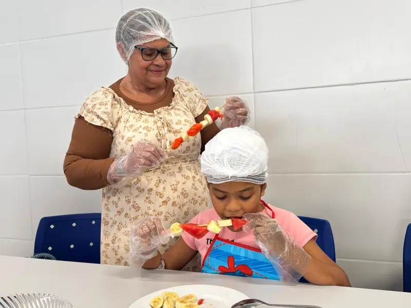 No cardápio, espetinho, salada de frutas e bolo de cenoura com calda de chocolate 75% cacau foram preparados pelas crianças liberadas para participar da oficina.