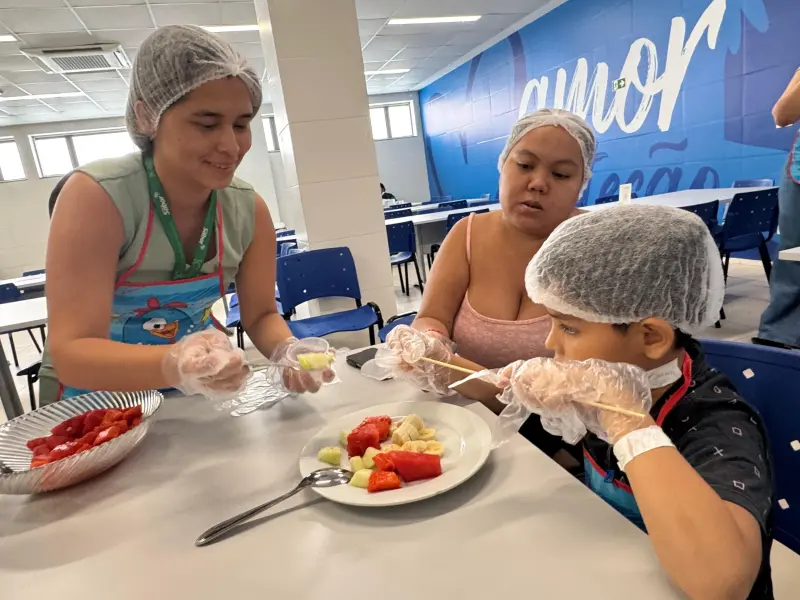 Pacientes da Unidade de Internação Pediátrica participaram de oficina de preparo de salada de frutas e bolo de cenoura com calda de chocolate 75% cacau