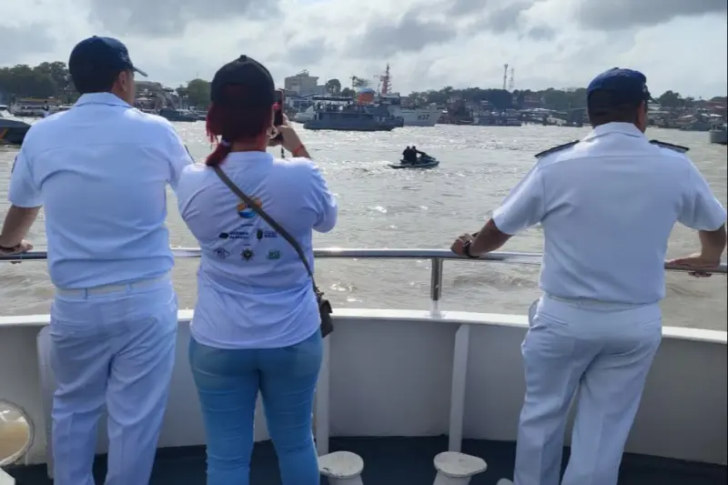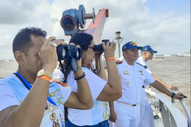 O navio Garnier Sampaio, da Marinha do Brasil, conduziu a imagem peregrina de Nossa Senhora de Nazaré pelas águas da Baía do Guajará, em um percurso de cerca de 18 quilômetros – aproximadamente 10 milhas náuticas – que ligou o novo Terminal Hidroviário Turístico de Icoaraci à Escadinha da Estação das Docas, em Belém.