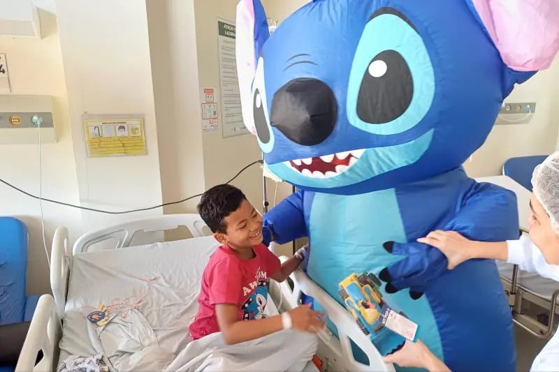 Mas quem também esteve por lá foi o personagem infantil "Stich", em uma versão gigante. Um artista vestiu a fantasia inflável e fez a alegria dos pequenos, levando abraços, presentes e muita esperança. "Eu vim visitar as crianças e foi maravilhoso. Conhecer os pequenos aqui do Hospital foi ótimo. Obrigado a todos que nos receberam aqui", destacou o artista, que não quis ter a identidade revelada.