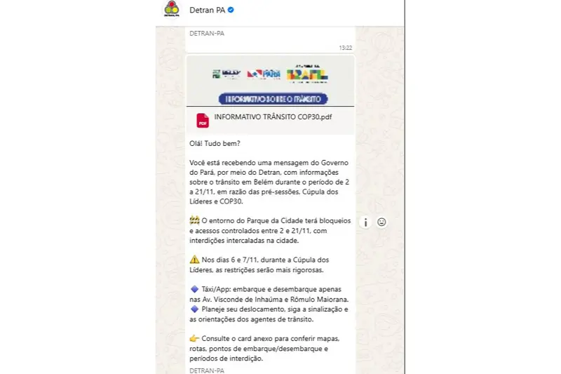 O governo do Pará, por meio do Departamento de Trânsito do Estado (Detran), iniciou o envio de mensagens informativas via WhatsApp para a população de Belém. A ação tem o objetivo de manter os cidadãos informados sobre as interdições e mudanças no tráfego entre os dias 2 e 21 de novembro, durante as pré-sessões, a Cúpula dos Líderes e a 30ª Conferência das Nações Unidas sobre Mudança do Clima (COP30).