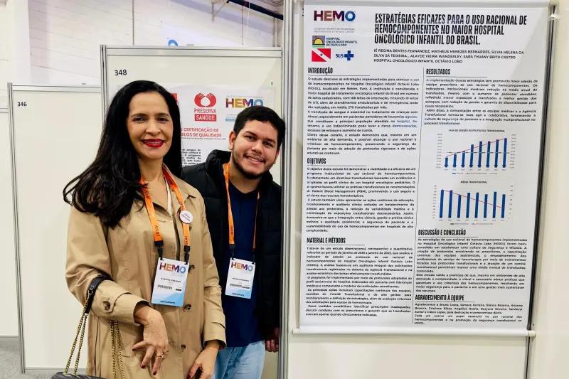 O Hospital Oncológico Infantil Octávio Lobo (Hoiol) marcou presença no Congresso Brasileiro de Hematologia, Hemoterapia e Terapia Celular - HEMO 2025, realizado de 29 de outubro a 1º de novembro, em São Paulo (SP). A diretora técnica, Alayde Vieira, a hematologista Iê Fernandez e o biomédico Matheus Bernardes apresentaram o estudo “Estratégias Eficazes Para o Uso Racional de Hemocomponentes no Maior Hospital Oncológico Infantil do Brasil”, e destacaram a contribuição à segurança transfusional e ao uso responsável dos hemocomponentes em pacientes pediátricos com câncer.