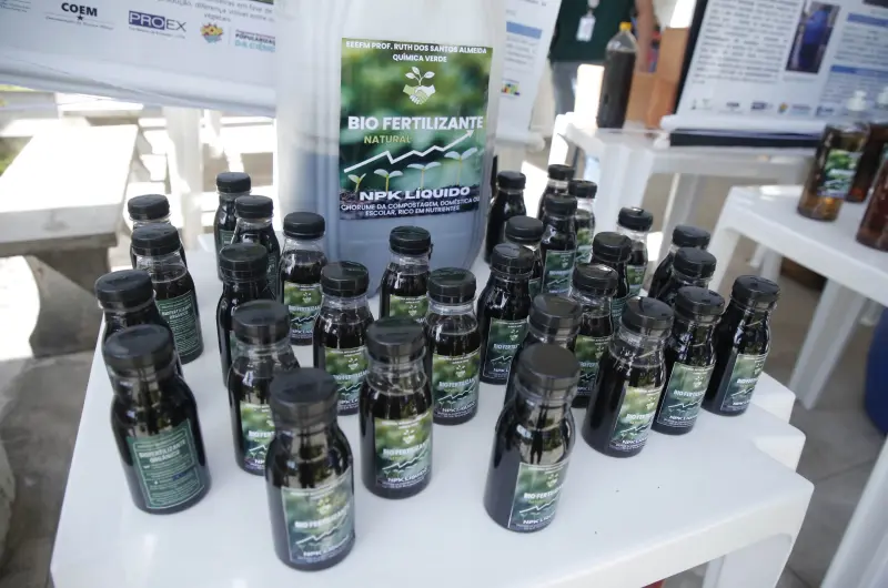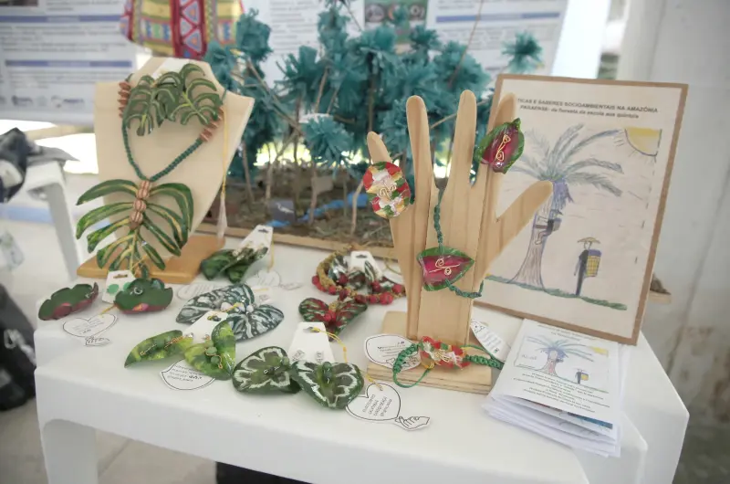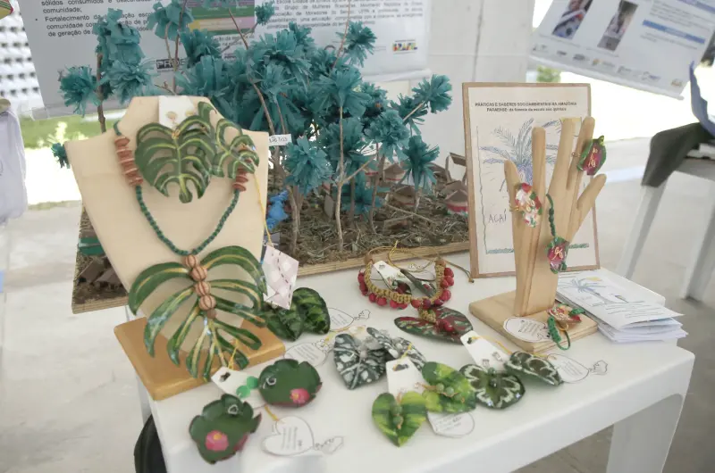 Nos estandes, os visitantes puderam conhecer projetos que transformam resíduos em produtos úteis e sustentáveis. A estudante Sammya Cunha, do 1º ano da Escola Dr. Antônio Gondim Lins, localizada em Ananindeua, apresentou com sua equipe um projeto de fabricação de jacarés decorativos com materiais recicláveis.