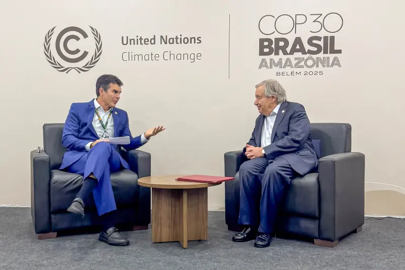 Papel da Amazônia - Um dos pontos altos da agenda foi a reunião bilateral entre o governador Helder Barbalho e o secretário-geral da ONU, António Guterres. No encontro, realizado em Belém, o governador tratou especificamente sobre o início da COP30 na capital paraense, o papel estratégico da Amazônia na estabilidade climática do planeta e as formas pelas quais o Pará pode contribuir de maneira concreta com a agenda climática mundial.