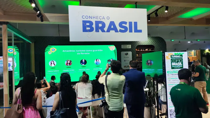 Denominado “Conheça o Brasil”, o estande sediará uma série de painéis, ativações e lançamentos, que reafirmam o compromisso do País com um turismo sustentável, inclusivo e de baixo carbono. O primeiro dia de atividades foi inteiramente dedicado à Amazônia, destacando a diversidade cultural e a força das comunidades tradicionais.