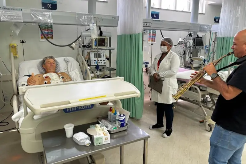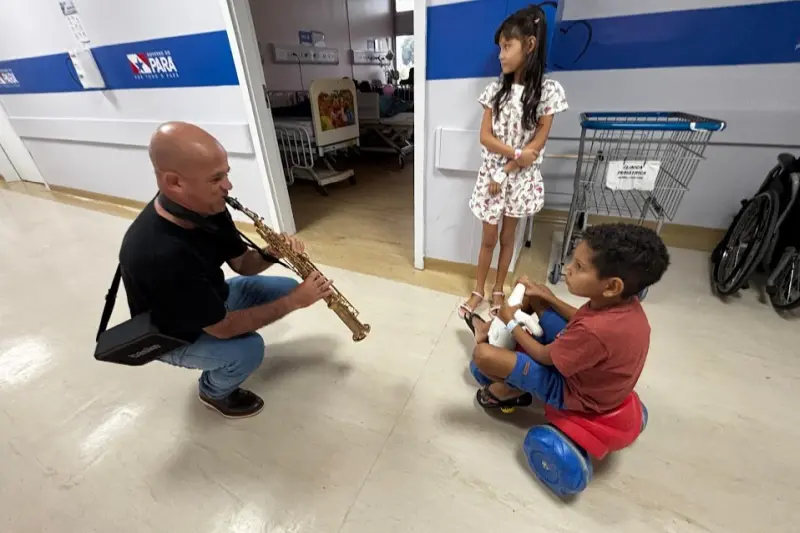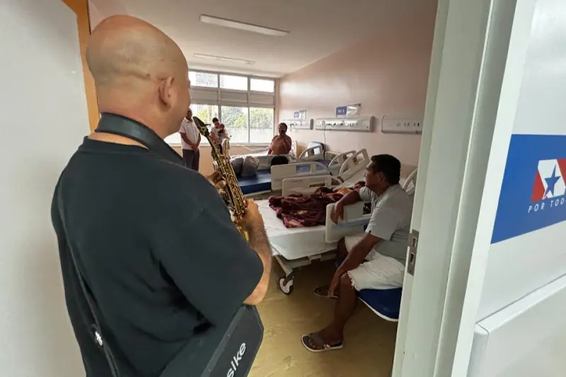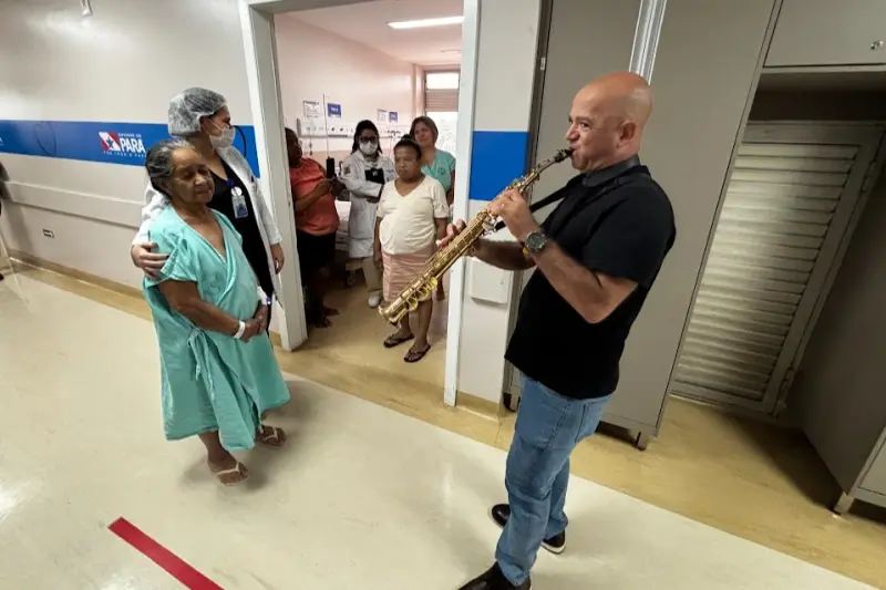 O som do saxofone ecoou pelos corredores do Hospital de Clínicas Gaspar Vianna (HC), em Belém, na manhã desta terça-feira (11), levando emoção e esperança a pacientes, acompanhantes e servidores. A surpresa foi promovida pelo músico voluntário Geovany Monteiro, que costuma visitar o hospital para oferecer, por meio da música, momentos de fé e conforto a quem vive a rotina hospitalar. Durante a ação, o músico passou pelas clínicas cirúrgica, médica, cardiológica, obstétrica, emergência cardiológica, Serviço de Terapia Renal Substitutiva e UTI Coronariana, compartilhando melodias que tocaram corações e despertaram sorrisos.