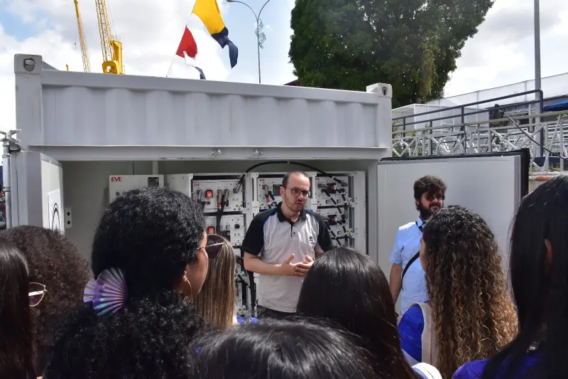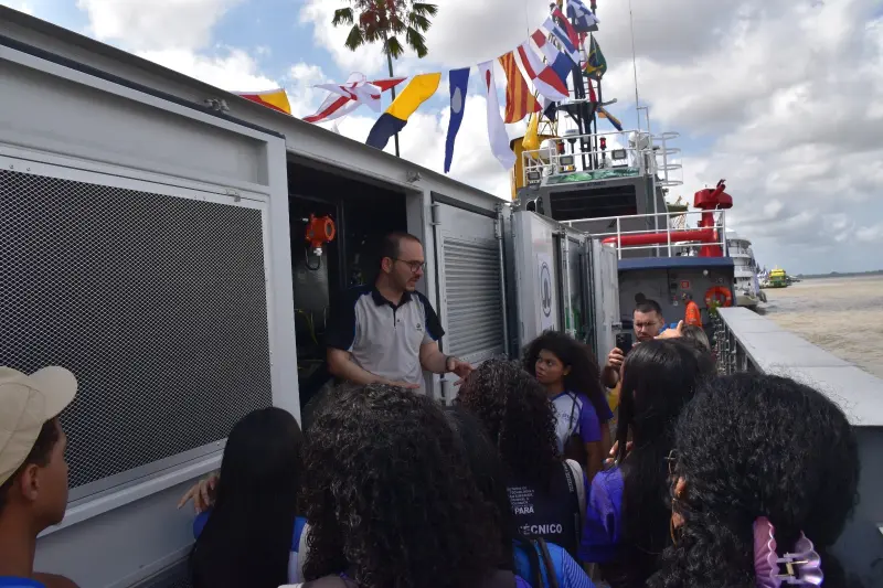 Os estudantes participaram de um circuito de visitação técnica para conhecer o funcionamento da embarcação e também acompanharam o painel “Impulsionando Territórios: parcerias e saberes para o desenvolvimento sustentável”, realizado pelo Instituto Mondó, que reuniu pesquisadores, gestores públicos e representantes de instituições comprometidas com a transição energética e a sustentabilidade na Amazônia.