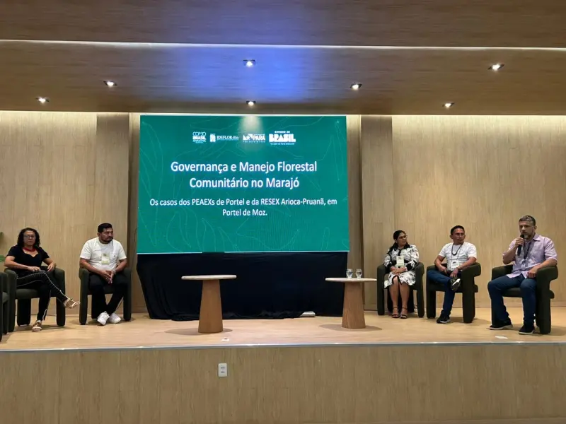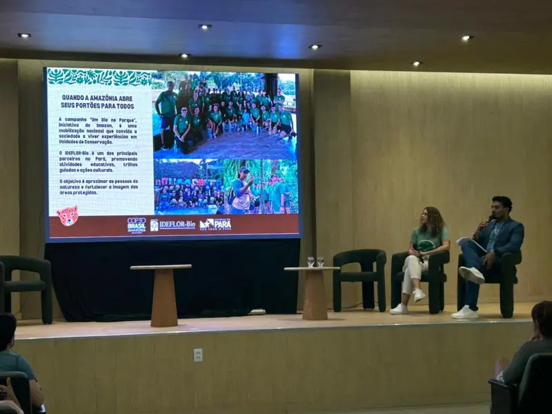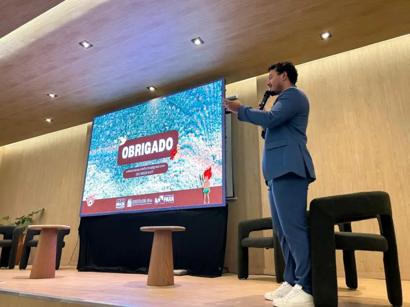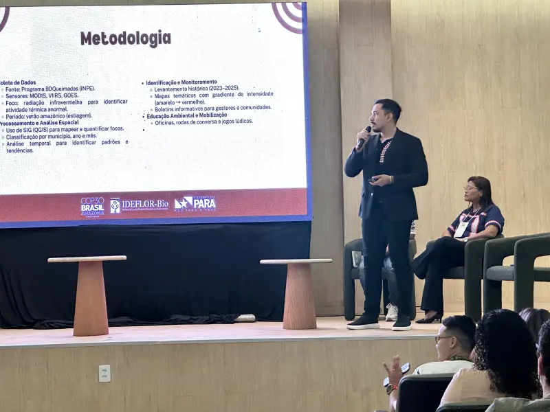 A manhã também reuniu experiências aplicadas no Arquipélago do Marajó, com o painel sobre educação ambiental e prevenção de queimadas do Projeto Verão, apresentado pelo gerente da Região Administrativa do Marajó do Ideflor-Bio, Hugo Deleon, juntamente com Nayana Silva e Matheus Cosme.