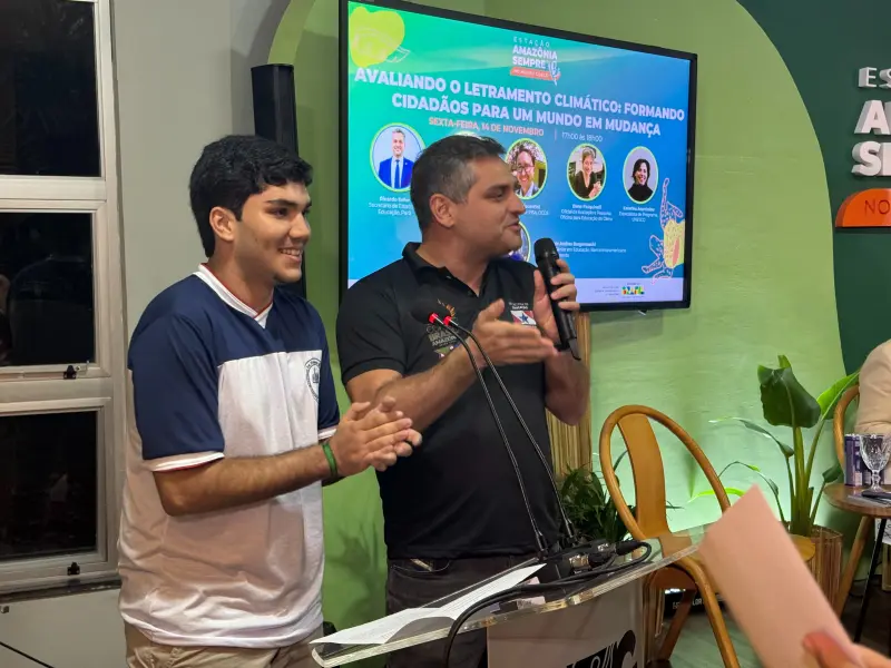 Ao final do encontro, o aluno Artur Sanches, do 9° ano do Ensino Fundamental da Escola Estadual Dr. Fábio Luz, localizado em Tomé-Açu, recebeu um certificado por conquistar o primeiro lugar no exame “Alfabetização Climática”, realizado pela OCDE em conjunto com a Seduc em uma iniciativa pioneira que busca medir o nível de conhecimento, atitudes e competências dos estudantes em relação às mudanças climáticas.