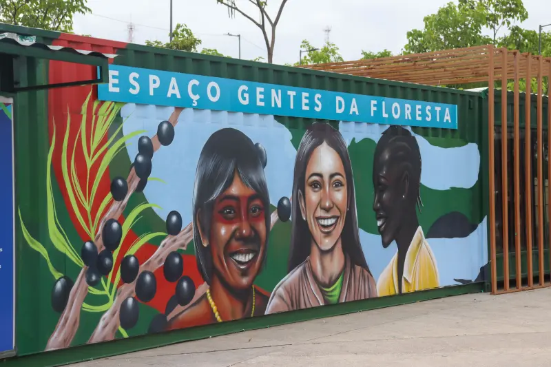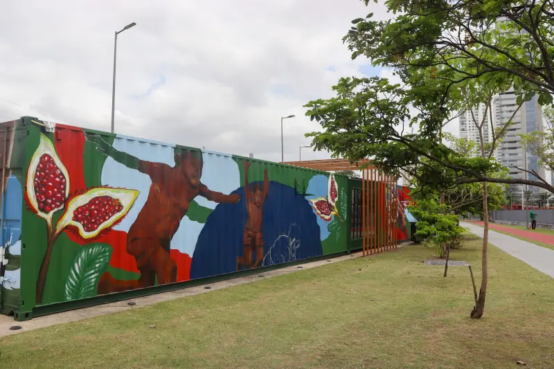 O complexo de contêiners do espaço “Gentes da Floresta” foi cuidadosamente estilizado pela artista visual paraense Mama Quilla. Abordando elementos amazônicos, paraenses e reforçando os traços amazônidas na representação humana do seu painel, Mama Quilla traduziu as raizes do povo da floresta em sua arte.