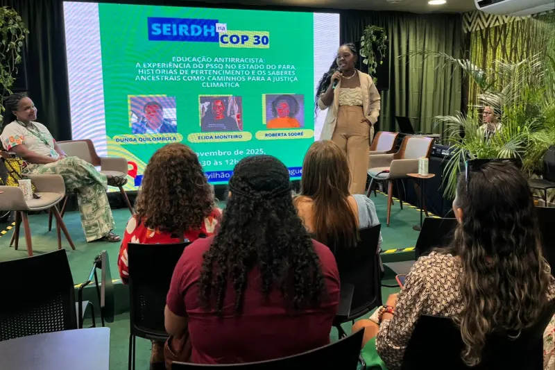 A Secretaria de Estado de Igualdade Racial e Direitos Humanos do Pará (Seirdh) apresentou, neste sábado (15), no Pavilhão Pará, na Green Zone da 30ª Conferência das Nações Unidas sobre Mudanças Climáticas (COP30), o painel “Educação Antirracista: A Experiência do PSSQ no Estado do Pará — Histórias de Pertencimento e Saberes Ancestrais como Caminhos para a Justiça Climática”. A atividade reuniu participantes para discutir políticas públicas que integram igualdade racial, educação e enfrentamento da crise climática.