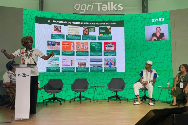 A Arena Agri Talks, na AgriZone, instalada na sede da Empresa Brasileira de Pesquisa Agropecuária (Embrapa) da Amazônia Oriental, foi palco de debate sobre as políticas públicas para Povos Tradicionais de Matriz Africana (Potma), neste domingo (16), durante a programação da Conferência das Nações Unidas sobre Mudança Climática do Clima (COP30), em Belém.