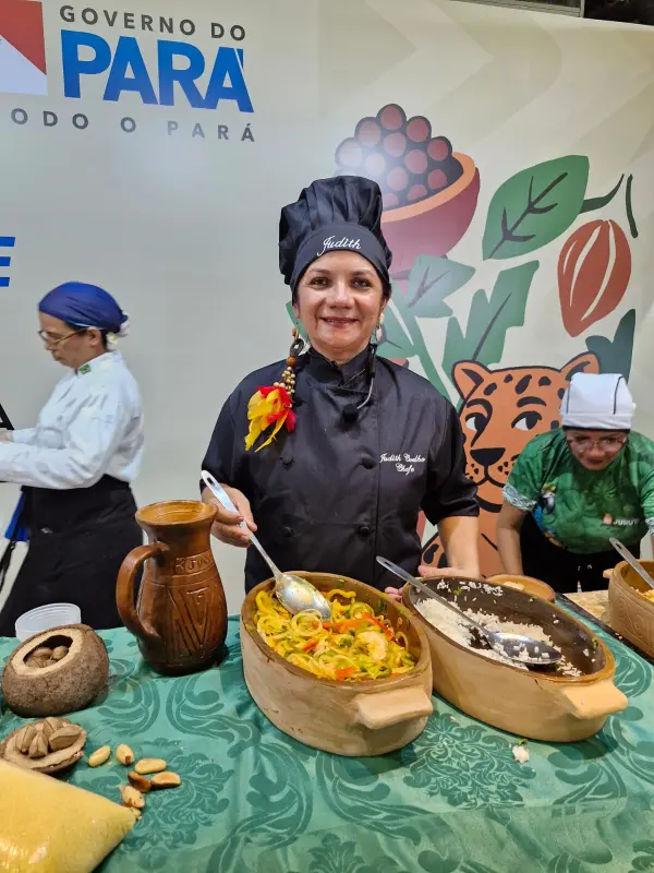 Herança indígena - Na sequência, a chef Judith Coelho, de Juruti, apresentou o tradicional "pirarucu ao leite de castanha-do-pará", preparado sem dendê, leite de coco ou creme de leite, preservando características da culinária indígena. A receita é acompanhada de farofa de piracuí, banana e arroz. “Essa inspiração vem de muito tempo. Minha mãe fazia muito pirarucu com leite da castanha, assim como jabuti. Essa lembrança de infância me acompanha até hoje”, relatou. Com mais de três décadas dedicadas à gastronomia, Judith celebrou a oportunidade de retomar sua participação em eventos estaduais: “É uma grande satisfação. Um momento ímpar para mim”, acrescentou.